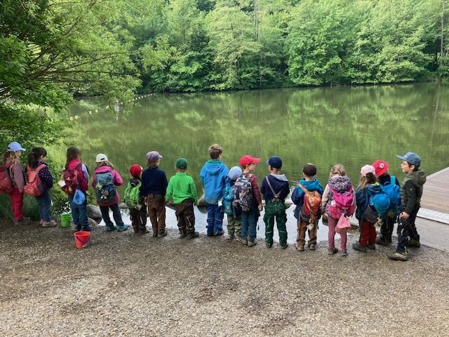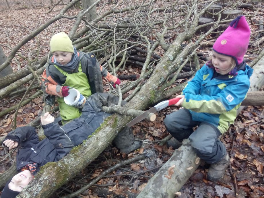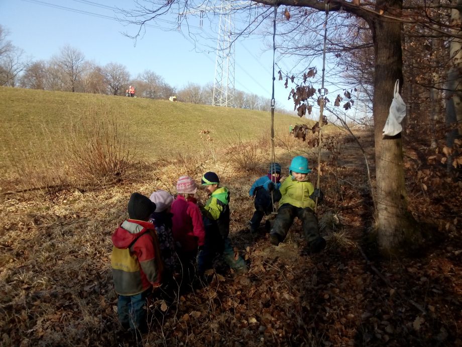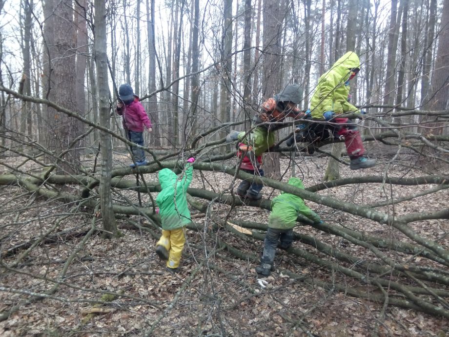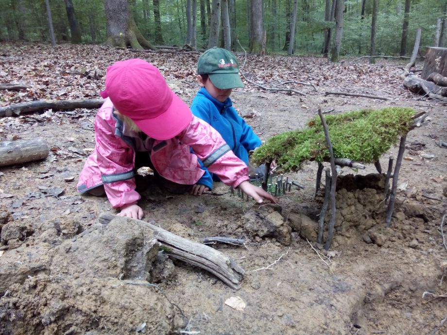 Der Wald bietet offene, weite Spielräume und viel Spielmaterial. Bewegung und Spielen in der Natur schulen die Motorik, fördern die Phantasie und die Beobachtungsgabe. Die Kinder können sich zwischen den Bäumen austoben oder auch mal ganz konzentriert einem krabbelnden Käfer zusehen. Spielen in der Natur bietet viel Anlass zum Sprechen. Die Kinder müssen sich nicht nur miteinander einigen, sondern sie müssen viel erklären. So ist ein Ast mal eine Regenrinne, eine Schlange oder eine Rakete.