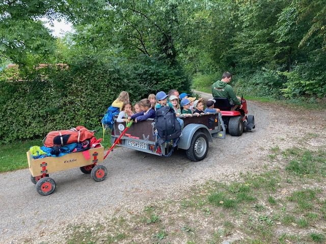 Jedes Kind trägt im Rucksack eine Trinkflasche, ein gesundes Vesper und eine Sitzmatte. Im Bollerwagen befinden sich dazu Wassersäcke, Seife, Handtücher, Klopapier, Teekannen, Spiel- und Bastelmaterial und natürlich ein Verbandskasten.